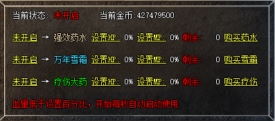 【设置喝药】:设置HP,MP最低比例即可,默认HP、MP任意一点少就开始喝药!